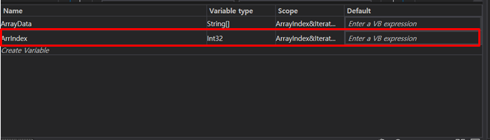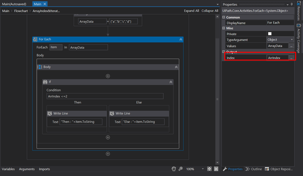 1."For Each" Activity의 Properties 의 Ouput / Index값에서 변수값 생성