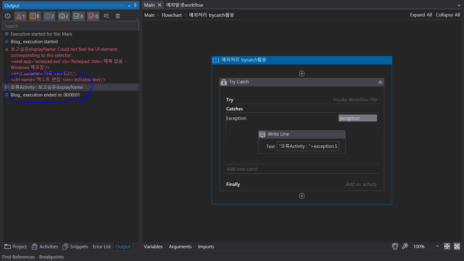(Invoke workflow)를 Try 부분에 넣어서 정확하게 어떤 Activity 에서 오류가 나는지 확인하기 위해 사용해 보도록 하자.
