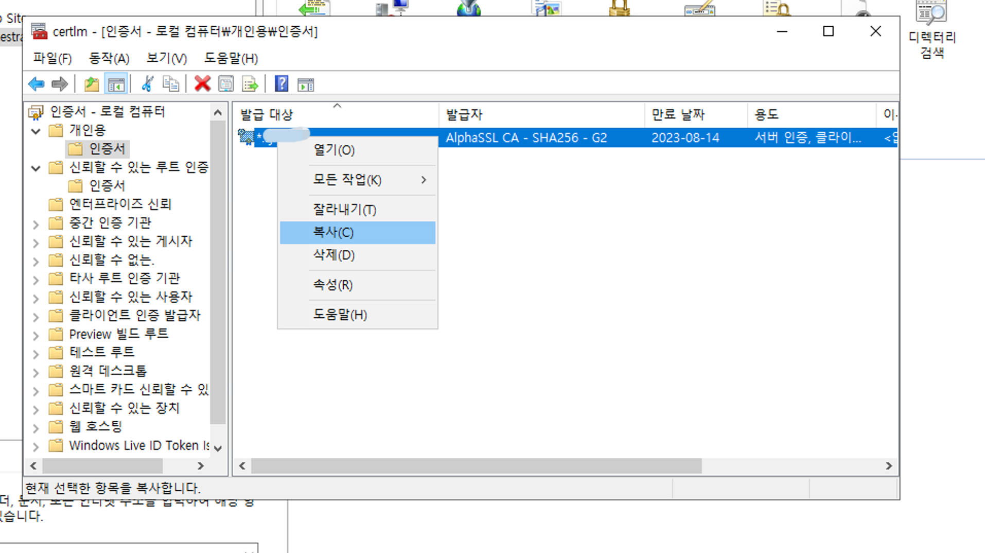 아래는 실행창(win + r) 에서 certlm.msc