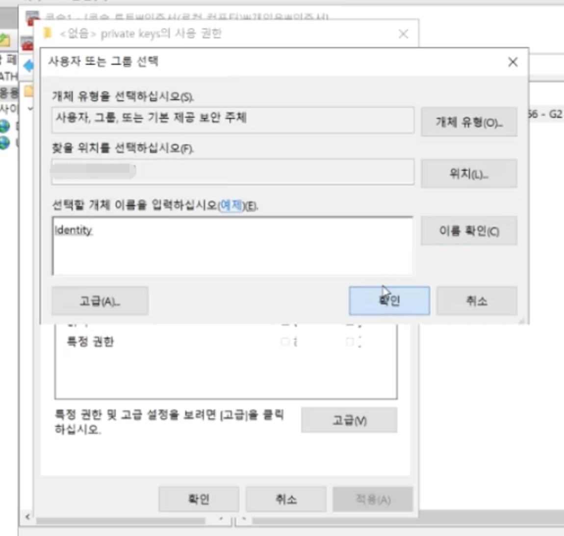 아래 입력창에 "IIS APPPOOL\Identity" 입력 후 오른쪽에 '이름 확인' 을 눌러본다.