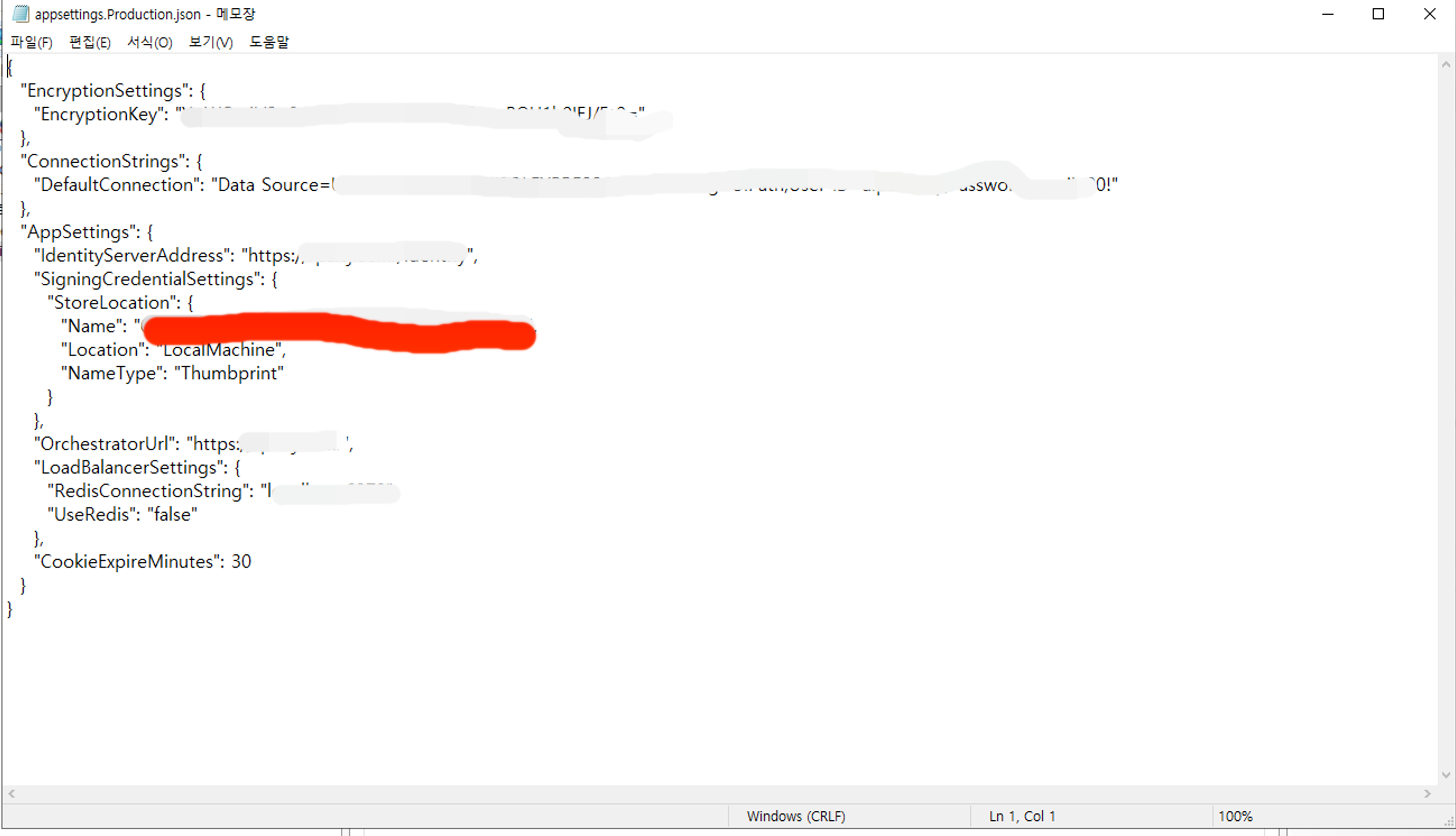 기본경로는 "C:\Program Files (x86)\UiPath\Orchestrator\Identity" 들어가서 "appsettings.Production.json" 파일을 열어서(열때 관리자 권한으로 열기)