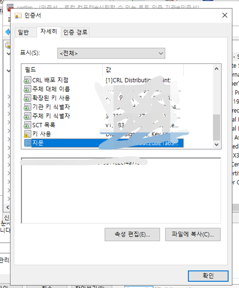 그 다음 인증서를 더블클릭 후 들어가서 지문키를 복붙해 오자. (메모장에 일단 복붙)