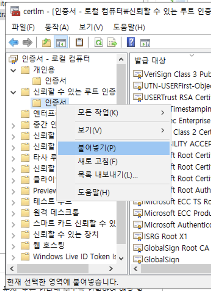 새로운 인증서를 복사 후에 밑에 '신뢰할 수 있는 루트 인증 기관' 폴더에도 붙여넣기를 해주자.