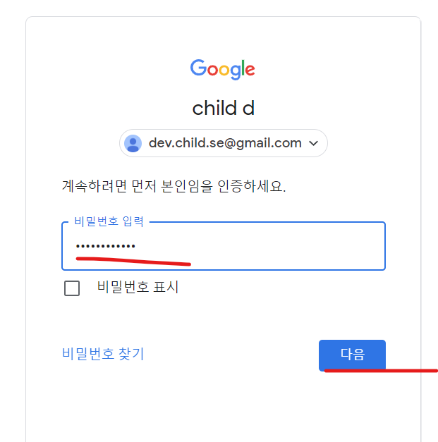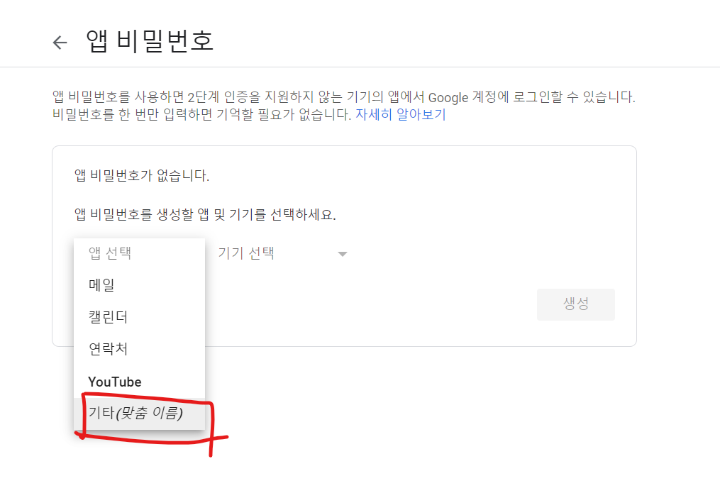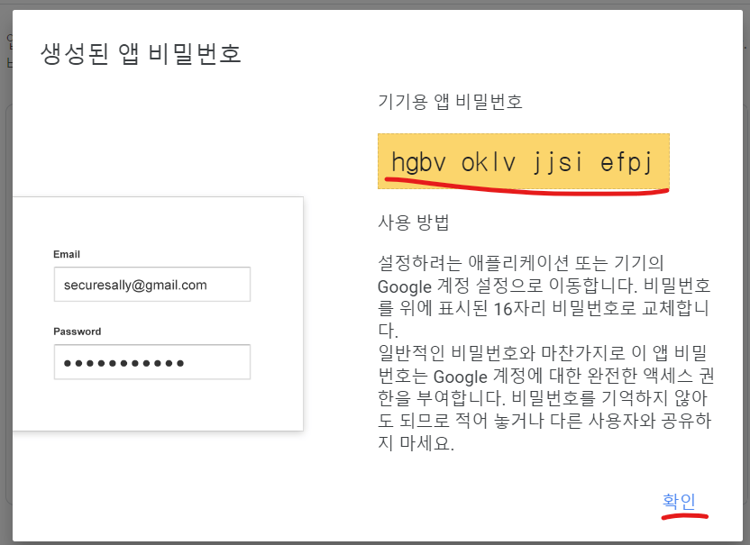 이제 아래처럼 앱 비밀번호가 생성이 되는데 이 비밀번호를 아까 보이는 로그인 페스워에 입력해 주어야한다.
