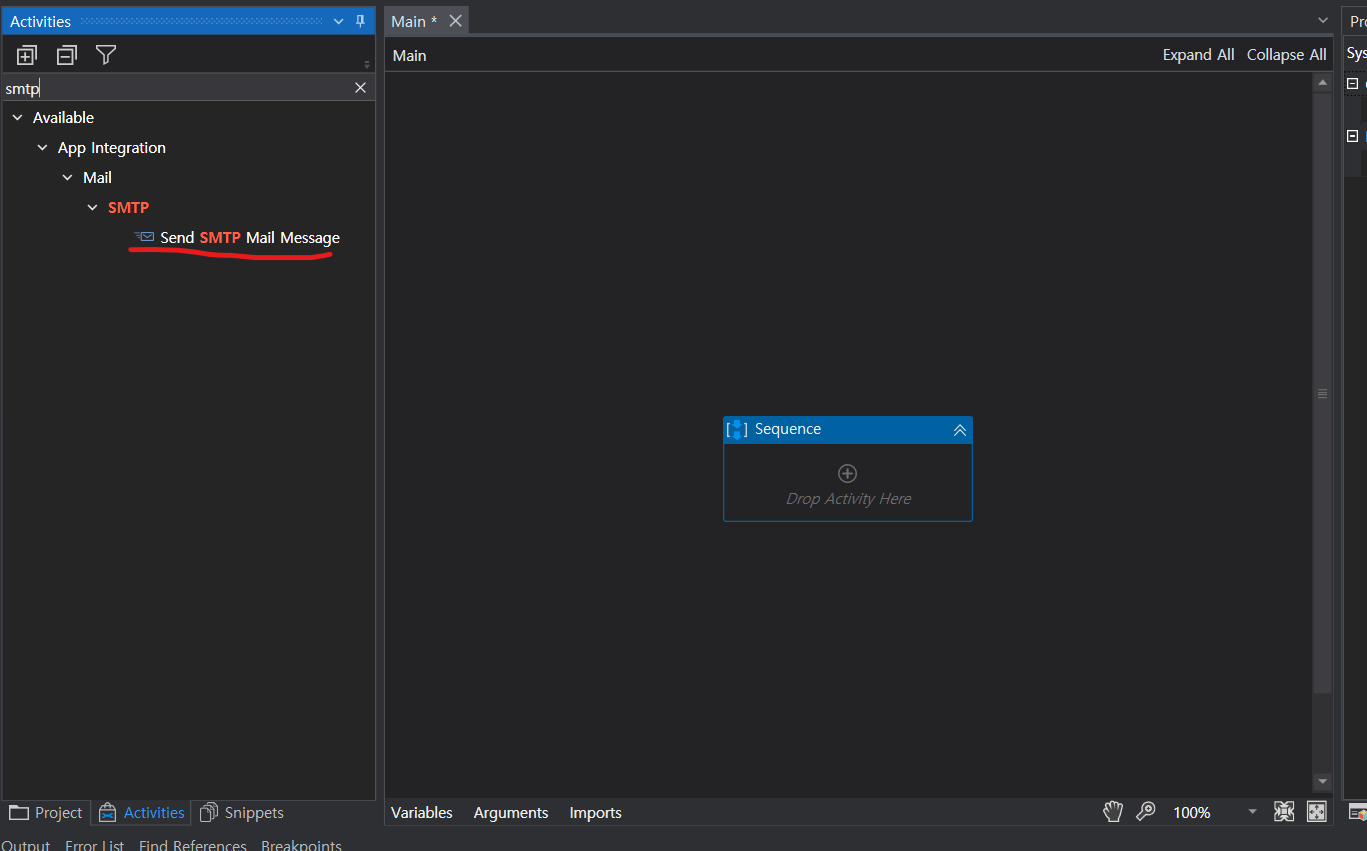 우선 Uipath Activity 에서 smtp 라고 검색하면 아래와 같이 나오는 해당 Activity를 사용하면 됩니다.