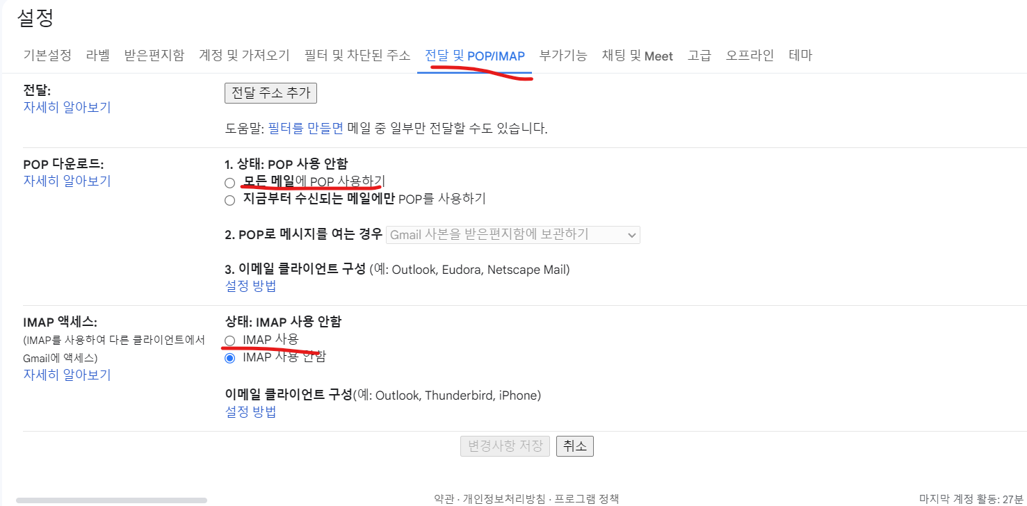 2. 전달 및 POP/IMAP 들어가서 아래 체크후 변경사항 저장.