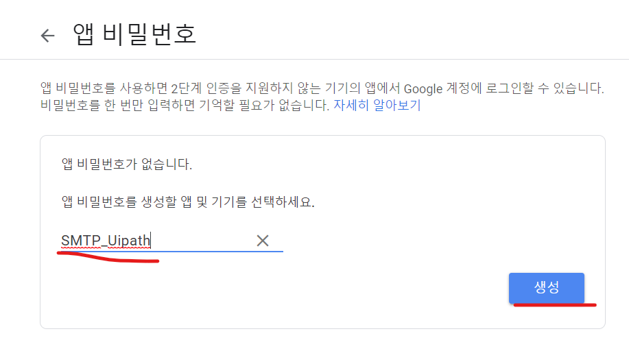 이제 아래처럼 앱 비밀번호가 생성이 되는데 이 비밀번호를 아까 보이는 로그인 페스워에 입력해 주어야한다.