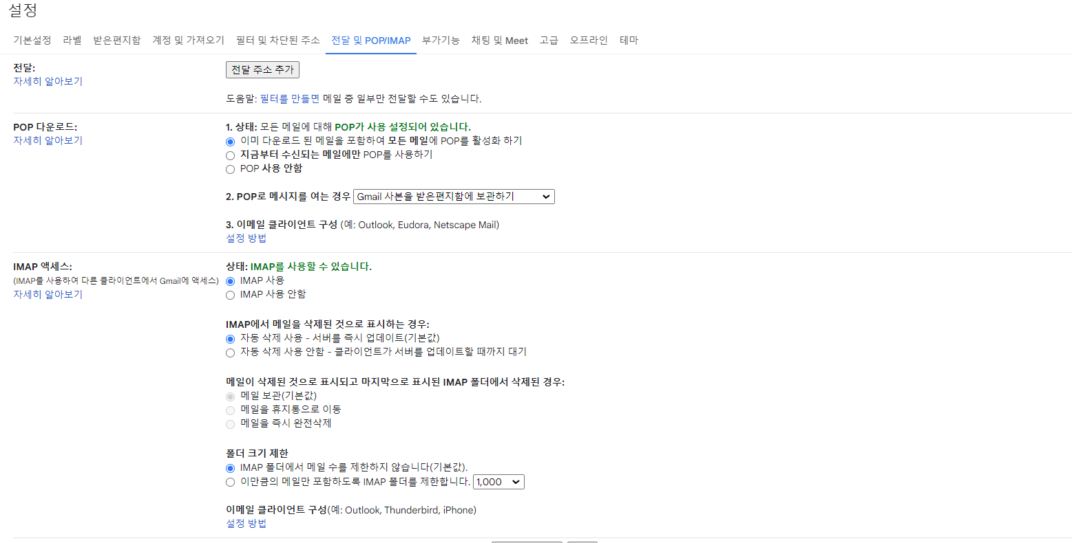 2. 전달 및 POP/IMAP 들어가서 아래 체크후 변경사항 저장.
