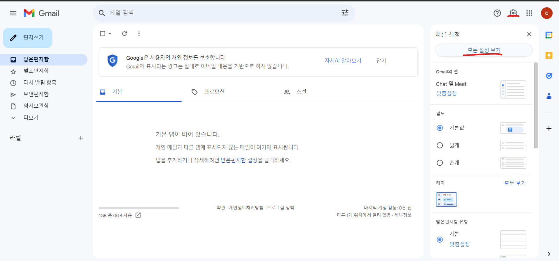 1. Gmail 들어가서 오른쪽위 설정 클릭 후 모든 설정 보기