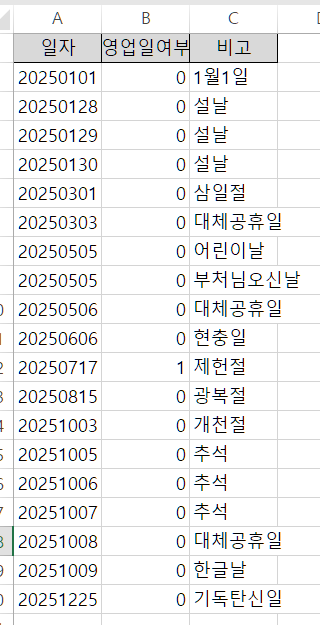 아래 데이터와 함께 살짝 가공만해서 1년 전체 영업일 리스트를 엑셀로 생성해 보겠습니다.