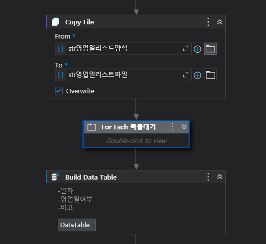 for each 의 body 부분은 아래와 같이 선언해서 데이터 테이블에 넣었습니다.