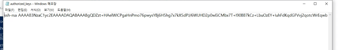 이제 Client 에서 받아온 "id_rsa.pub" 파일 내용을 "$home\.ssh\authorized_keys" 입력해준다.