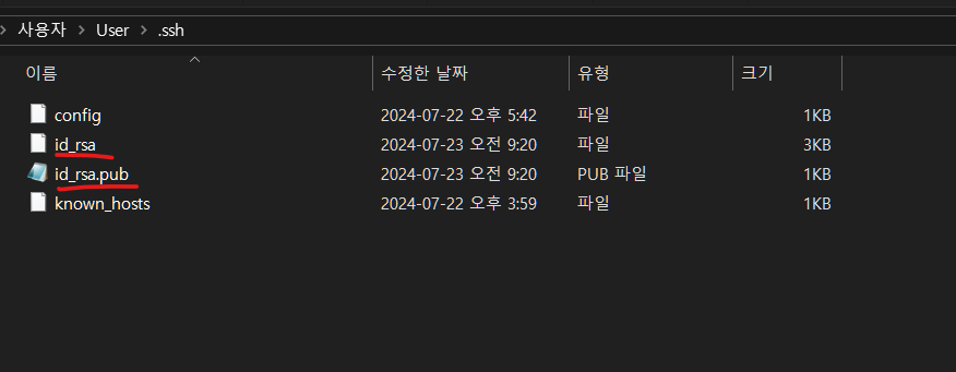 생성하고 "%userprofile%\.ssh" 경로로 들어가 보면 파일 2개가 새로 생성된 걸 볼 수 있다.